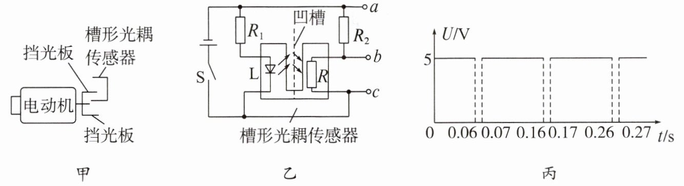 7. 如图甲所示,小明在电动机的转动轴上固定一个“山”字形挡光板,利用槽形光耦传感器来测量电动机的转速。槽形光耦传感器两侧分别装有红外发光二极管 L,以及阻值为 R 的光敏电阻,当光敏电阻接收到二极管 L 发出的红外线时,电阻为 0,未接收到红外线时,电阻很大,相当于断路。图乙为测量电路图,电源电压为 5 V。