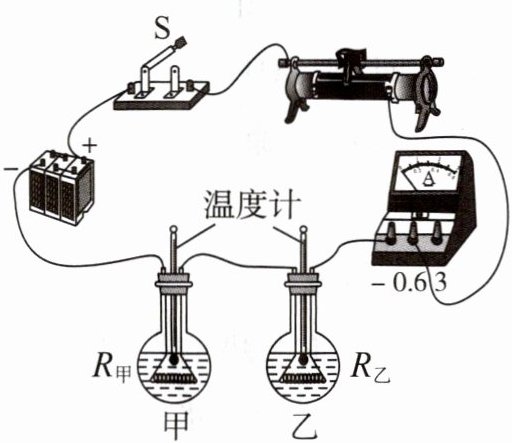 2. (2024·江苏泰州中考) 下图是探究影响电流热效应的因素的实验装置,甲、乙两个完全相同的烧瓶内装有等质量的同种液体,阻值分别为$ R_{甲} 、$$ R_{乙} $的电阻丝分别浸没在两烧瓶的液体中且$ R_{甲} \neq R_{乙} 。$有下列四种观点: