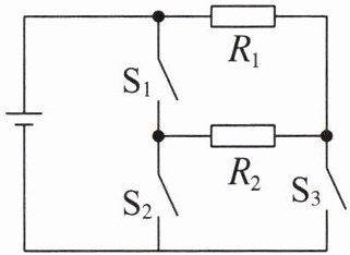 8. 某款电热杯有高、中、低三挡,简化电路如图所示。$ S_{1} $、$ S_{2} $不能同时闭合,阻值$ R_{1} 为 2.5\ \Omega $。只闭合$ S_{3} $时,电路中的电流为$ 2\ A $。水的比热容为$ 4.2 × 10^{3}\ J/(kg \cdot ^{\circ}C) $。下列说法正确的是(
