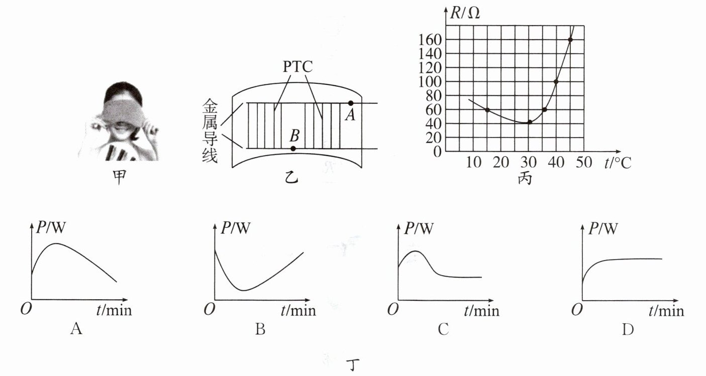 (4)由题图丙可知,PTC加热丝的阻值随温度的升高,先变小后变大,由题意可知,当温度达到$40^{\circ }C$时,PTC加热丝的发热功率等于散热功率,温度保持不变,即温度达到$40^{\circ }C$后PTC加热丝的阻值不变,因此眼罩加热电路开关闭合后,PTC加热丝的阻值先变小后变大再不变,由$P=UI=\frac {U^{2}}{R}$可知,其功率先变大后变小再不变,故图C符合题意。