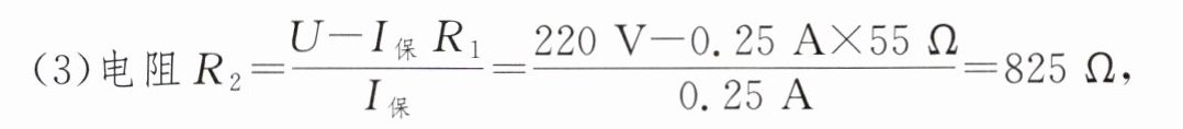 (3)电阻 $ R_{2} = \frac{U - I_{保}R_{1}}{I_{保}} = \frac{220 V - 0.25 A × 55 \Omega}{0.25 A} = 825 \Omega $,产生的热量 $ Q_{2} = I_{保}^{2}R_{2}t = (0.25 A)^{2} × 825 \Omega × 16 × 60 s = 4.95 × 10^{4} J $。