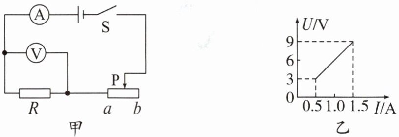 4. 如图甲所示,电源电压保持不变,闭合开关时,滑动变阻器的滑片P从b端滑到a端,电压表示数U与电流表示数I的变化关系如图乙所示,则定值电阻的阻值R是