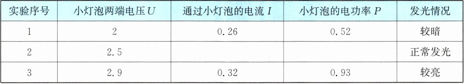 。| 实验序号 | 小灯泡两端电压U | 通过小灯泡的电流I | 小灯泡的电功率P | 发光情况 |