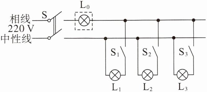 5. 电工师傅常用一只额定电压为 220 V 的灯泡 L₀(检验灯泡)取代保险丝来检查新安装的照明电路中每个支路的情况。如图所示,当开关 S 闭合后,再分别闭合开关$ S_1、$$S_2、$$S_3($每次只能闭合其中之一)时,下列各情况的判断正确的是(