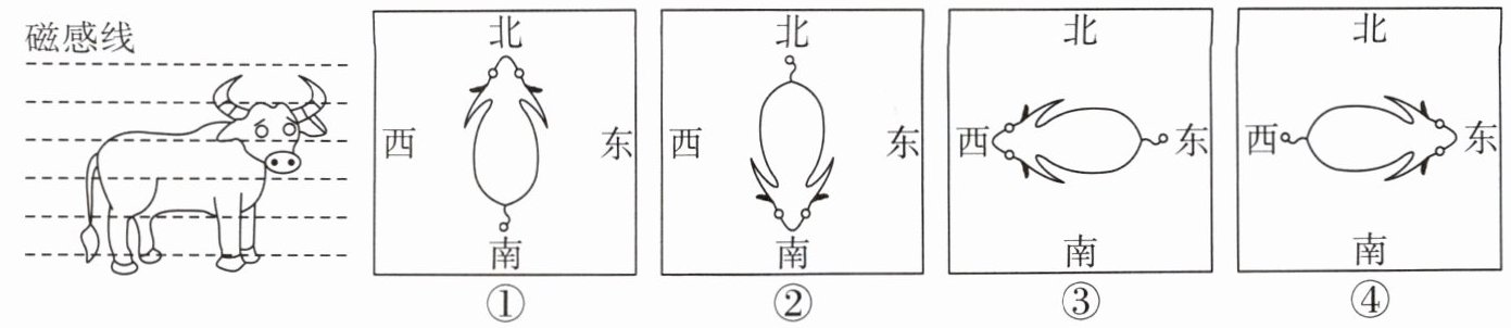 5. (2024·江苏常州中考)某网站曾报道:“牛能感知地球磁场,吃草、休息时,其身体朝向习惯与地磁场磁感线平行(如图所示)。”为求证真伪,同学们设计了如下实验方案:在四周无明显差异的草地上,多次观察牛吃草、休息时的身体朝向,若报道真实,则牛的身体朝向习惯性呈现四个场景中的(