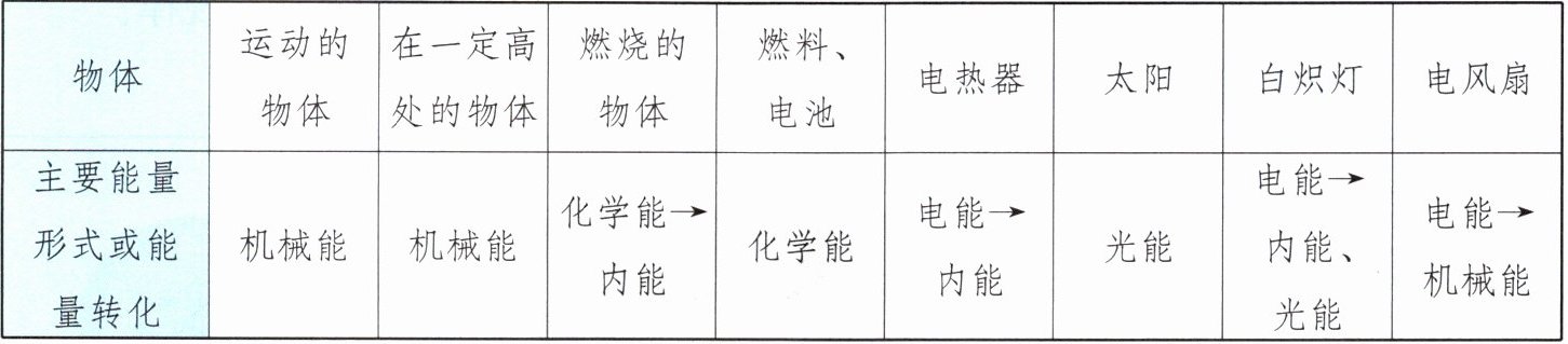 |物体|运动的物体|在一定高处的物体|燃烧的物体|燃料、电池|电热器|太阳|白炽灯|电风扇|