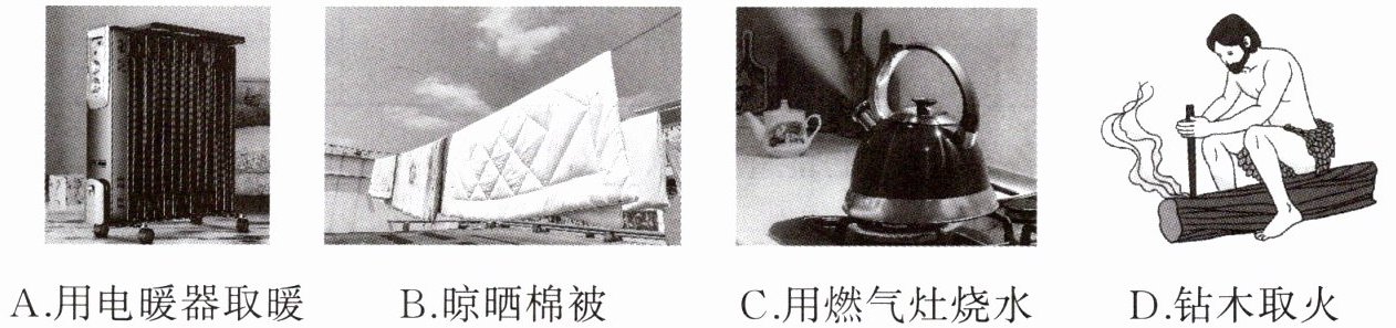 |A. 用电暖器取暖||B. 晾晒棉被||C. 用燃气灶烧水||D. 钻木取火||