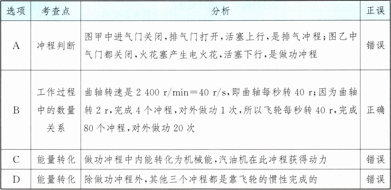 |B|工作过程中的数量关系|曲轴转速是2400 r/min = 40 r/s,即曲轴每秒转40 r;因为曲轴转2 r,完成4个冲程,对外做功1次,所以飞轮每秒转40 r,完成80个冲程,对外做功20次|正确|