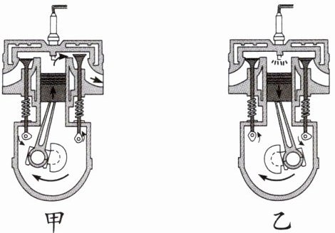 |A|冲程判断|图甲中进气门关闭,排气门打开,活塞上行,是排气冲程;图乙中气门都关闭,火花塞产生电火花,活塞下行,是做功冲程|错误|