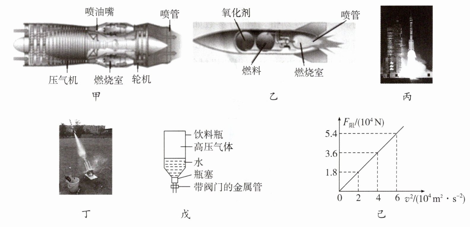 (2)制作并发射:火箭模型小组的同学制作了水火箭(图丁)并进行发射,图戊是其结构示意图,对水火箭打气,打开阀门,水向下喷出,水火箭一飞冲天。使用打气筒打气时的能量转化过程与汽油机的