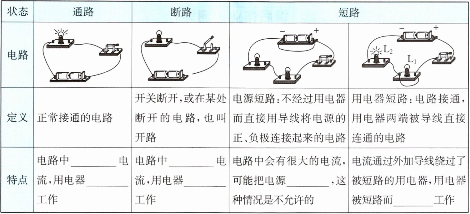 |定义|正常接通的电路|开关断开,或在某处断开的电路,也叫开路|电源短路:不经过用电器而直接用导线将电源的正、负极连接起来的电路|用电器短路:电路接通,用电器两端被导线直接连通的电路|
