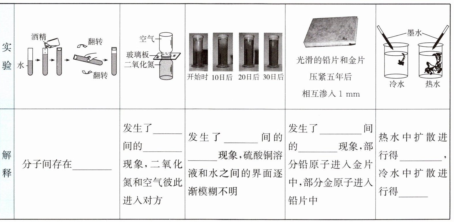间隙 气体 扩散 液体 扩散 固体 扩散 快 慢 1.间隙 2.进入对方 4.不停 5.热运动 温度