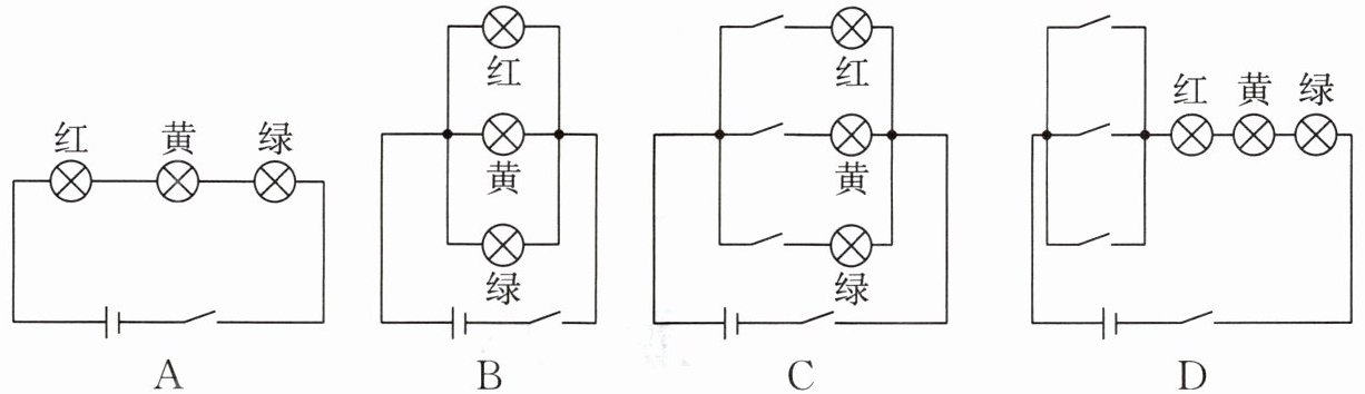 (2)红灯、绿灯、黄灯在工作时互不影响,并且各有一个开关控制,只有 C 选项电路图符合题意。