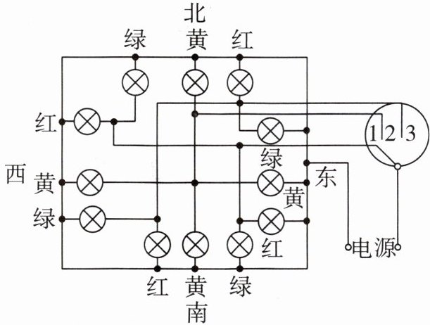 (3)但实际生活中,人站在东、南、西、北四个方向都能看见红绿灯信号,在老师的帮助下,他和同学们多次尝试,又设计出了如图所示的电路。当单刀多掷开关接通位置“1”时,