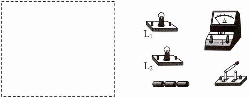 9. 在虚线框中画出灯泡$L_1和灯泡L_2$并联、电流表测通过灯泡$L_1$电流的电路图,并连接实物图。
