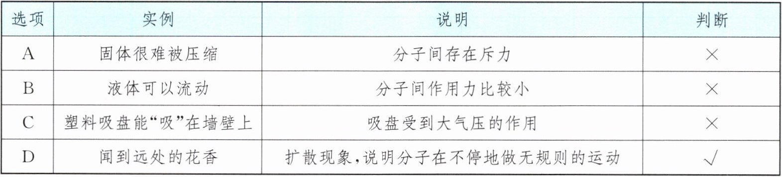 |D|闻到远处的花香|扩散现象,说明分子在不停地做无规则的运动|√|