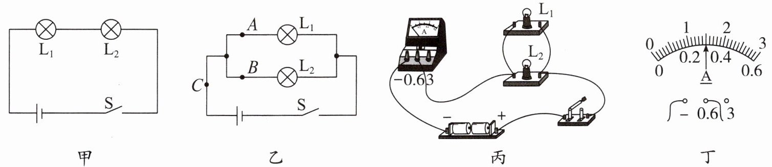(4)实验小组又一起做探究并联电路中电流规律的实验,图乙是他们设计的电路图,实验时需要测量A、B、C三处的电流。图丙是他们连接的实验电路,图丁为电流表读数,此时电流表测量