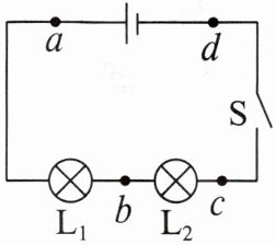 3. 如图所示,闭合开关 $ S $ 后,灯 $ L_1 $ 和 $ L_2 $ 均不亮。为了查找电路故障,小明将电流表依次并联在 $ a $、$ b $,$ b $、$ c $,$ c $、$ d $ 两点间,发现电流表接在 $ c $、$ d $ 两点间时,两灯发光,则电路故障可能是(