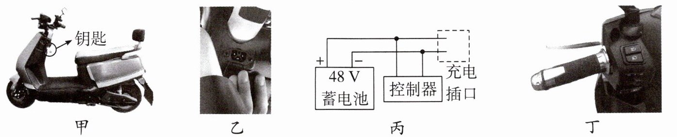 (1)图乙是电动车的充电插口,内有金属插脚,在使用过程中绝不能用硬币、手等触碰;图丙是电动车的局部电路图,其中控制器是指电动车利用蓄电池工作的所有用电器。如果硬币碰到充电插口的两个金属插脚,就可能会造成______(选填“蓄电池”或“控制器”)损坏。