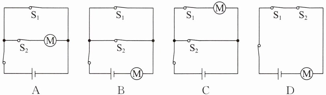 (3)电动自行车两刹车手柄(如图丁所示)中各有一个开关 $ S_1 $ 和 $ S_2 $。在行驶过程中用任意一侧的手柄刹车时,该手柄上的开关立即断开,电动机停止工作,以下电路符合要求的是______。