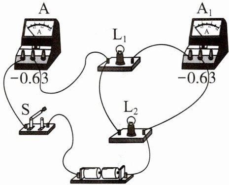 5. 如图所示的实验电路,闭合开关 $ S $ 后,电流表 $ A $ 的示数为 $ 0.5 $ A,电流表 $ A_1 $ 的示数为 $ 0.3 $ A。则通过小灯泡 $ L_1 $、$ L_2 $ 的电流分别是(