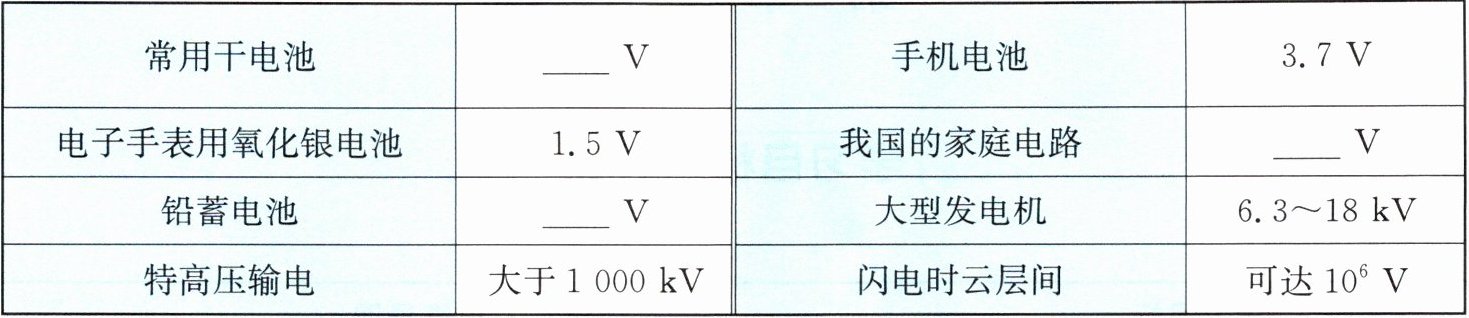 $V$|手机电池|$3.7\ V$||电子手表用氧化银电池|$1.5\ V$|我国的家庭电路|