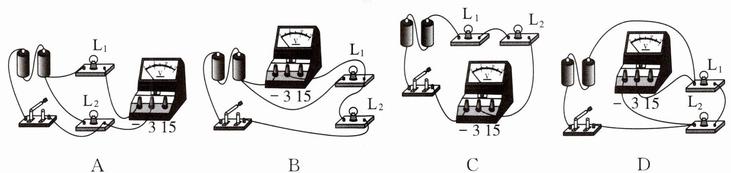 3. 下图是四个用电压表测量灯$L_{1}$两端电压的实物连接图,正确的是(