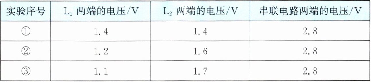 。|实验序号|$L_1$ 两端的电压/$V$|$L_2$ 两端的电压/$V$|串联电路两端的电压/$V$|