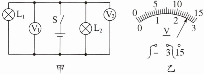 4. 如图甲所示的电路中,闭合开关 $S$ 后,电压表 $V_1$ 的示数如图乙所示,则电压表 $V_1$ 的示数为