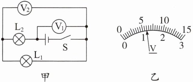 由图甲可知,$V_2$测$L_1$两端电压,$V_1$测电源电压,因为串联电路中电源电压等于各用电器两端电压之和,所以$V_1$量程是$0 - 15V$,$V_2$量程是$0 - 3V$。
