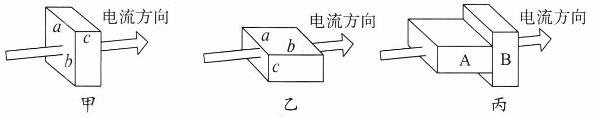 (选填“甲”或“乙”);若按照图丙的方式把两个金属块接在电源两端,则通过两金属块的电流$I_{A}$______=