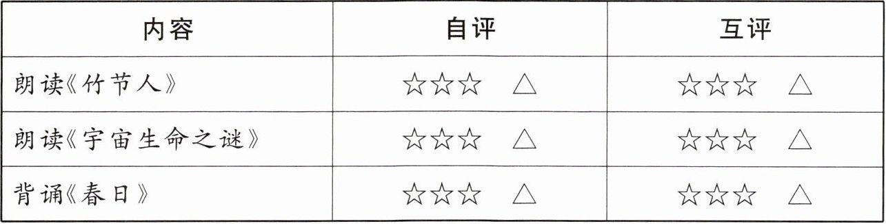 内容:朗读《竹节人》,自评:☆☆☆△,互评:☆☆☆△;