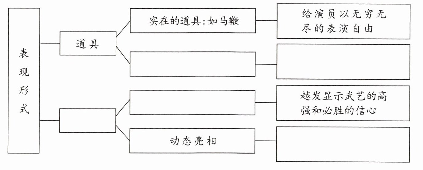 | 表现形式 | 道具 | 实在的道具:如马鞭 | 给演员以无穷无尽的表演自由 |