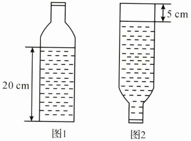 27.(6分)一个长12cm、宽12cm、高8cm的长方体容器中装满了水。小明先把容器中的水倒满2个底面半径为3cm,高为5cm的圆柱体杯子,再把剩下的水全部倒入瓶子甲中。瓶子甲正放时如图1,瓶内溶液的高度为20cm;瓶子甲倒放时如图2,空余部分的高度为5cm。(π取3,容器的厚度不计)