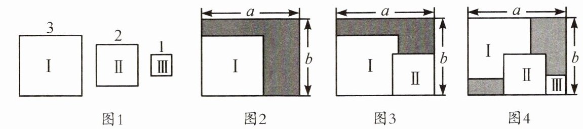 13. 如图1,现有三种边长分别为3,2,1的正方形卡片,分别记为Ⅰ,Ⅱ,Ⅲ,还有一个长为$a$,宽为$b$的长方形。