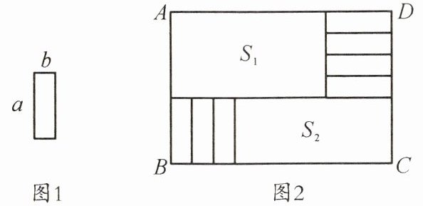 12. 将7张相同的小长方形纸片(如图1所示),按图2所示的方式不重叠地放在长方形$ABCD$内,未被覆盖的部分恰好被分割为两个长方形,面积分别为$S_{1}$,$S_{2}$,已知小长方形纸片的长为$a$,宽为$b$,且$a>b$。