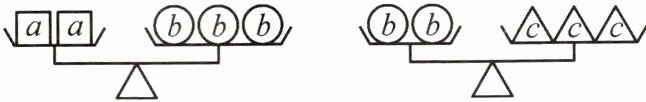 (1)由第一个天平可得$2a = 3b$,即$a=\frac{3}{2}b$;由第二个天平可得$2b = 3c$,即$b=\frac{3}{2}c$。