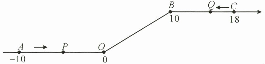 26. (6分)如图,将一条数轴在原点$O和点B$处各折一下,得到一条“折线数轴”。图中点$A$表示-10,点$B$表示10,点$C$表示18,我们称点$A和点C$在数轴上相距28个单位长度。动点$P从点A$出发,以2个单位长度/秒的速度沿着“折线数轴”的正方向运动,从点$O运动到点B$期间速度变为原来的一半,之后立刻恢复原速;同时,动点$Q从点C$出发,以1个单位长度/秒的速度沿着数轴的负方向运动,从点$B运动到点O$期间速度变为原来的两倍,之后也立刻恢复原速。设运动的时间为$t$秒。问: