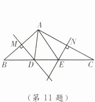 11. 如图,在△ABC中,AB,AC的垂直平分线分别交BC于点D,E,垂足分别为M,N,已知△ADE的周长为22,则BC的长为