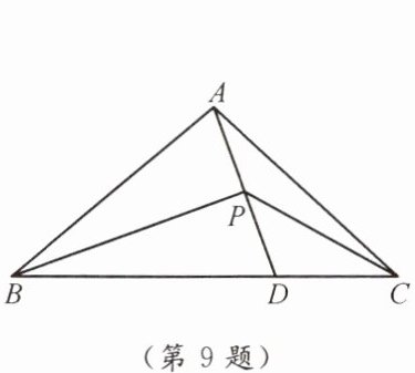 9. 如图,在△ABC中,BC>BA,在BC上截取BD= BA,作∠ABC的平分线与AD交于点P,连结PC,若△ABC的面积为$4 cm^2,$则△BPC的面积为(