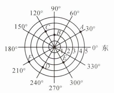 3. 如图是雷达探测器测得的结果,图中显示在点A,B,C,D,E,F处有目标出现,目标的表示方法为$(r,\alpha)$,其中,r表示目标与探测器的距离;$\alpha$表示以正东为始边,逆时针旋转后的角度。例如,点A,D的位置表示为$A(5,30^\circ)$,$D(4,240^\circ)$。用这种方法表示点B,C,E,F的位置,其中正确的是(