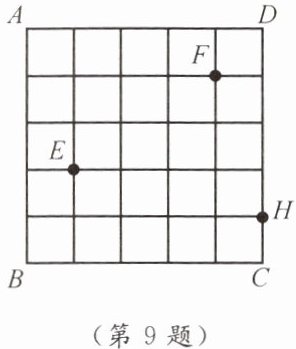 9. 如图,正方形网格ABCD由25个边长相等的小正方形组成,将此网格放到一个平面直角坐标系中,使$BC// x$轴,若点E的坐标为(-4,2),点F的横坐标为5,则点H的坐标为______。