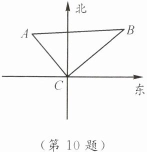 10. 如图,上午8时在一小岛C处测得一轮船在北偏西$40^\circ$方向30海里的A处沿直线航行,到当天上午10时,轮船在小岛的北偏东$50^\circ$方向40海里的B处,则轮船航行的平均速度为______。