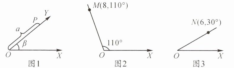11. 如图,将射线OX按逆时针方向旋转$\beta$,得到射线OY,如果P为射线OY上的一点,且$OP= a$,那么我们规定用$(a,\beta)$表示点P在平面内的位置,并记为$(a,\beta)$。例如,图2中,如果$OM= 8$,$\angle XOM= 110^\circ$,那么点M在平面内的位置记为$M(8,110^\circ)$,根据图形,解答下列问题: