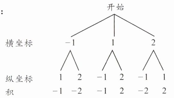 由树状图可知,在-1,1,2这三个数中任选2个数分别作为P点的横坐标和纵坐标,符合要求的点有(-1,1),(-1,2),(1,-1),(1,2),(2,-1),(2,1),共6种情况,当双曲线位于第一、三象限时,$xy= k>0$,只有(1,2),(2,1)符合$xy= k>0$.