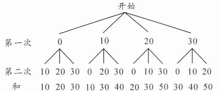 从上图可以看出,共有12种等可能的结果,其中大于或等于30元共有8种,因此P(不低于30元)$=\frac{8}{12}= \frac{2}{3}$.