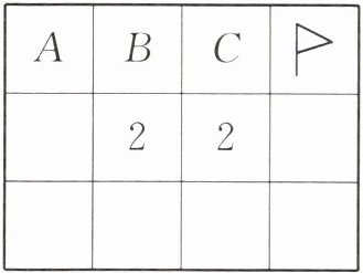 说明:图中数字2表示在以该数字为中心的8个方格中有2个地雷,小旗表示该方格已被探明有地雷,现在还剩下A,B,C三个方格未被探明,其他地方为安全区(包括有数字的方格).