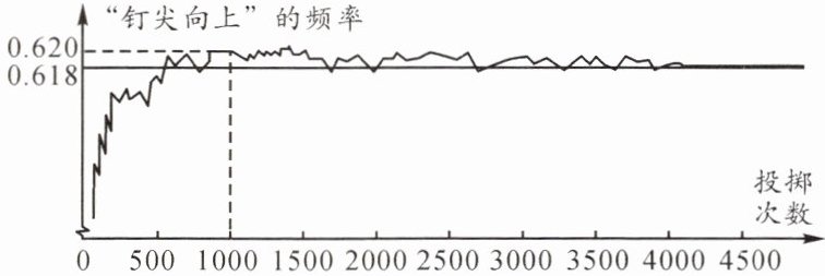 13. 如图所示为用计算机模拟随机投掷一枚图钉的某次试验的结果显示图象,下面有三个推断:①当投掷次数是500时,计算机记录“钉尖向上”的次数是308,所以“钉尖向上”的概率是0.616.②随着试验次数的增加,“钉尖向上”的频率总在0.618附近摆动,显示出一定的稳定性,可以估计“钉尖向上”的概率是0.618.③若再次用计算机模拟此试验,则当投掷次数为1000时,“钉尖向上”的频率一定是0.620.其中合理的是(