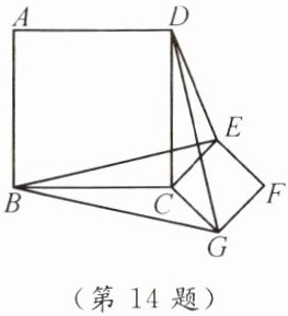 14. 如图,正方形ABCD和正方形CEFG的边长分别为a和b,正方形CEFG绕点C旋转,连结BE,BG,DE,DG,给出下列结论:①BE= DG. ②BE⊥DG. ③$DE^{2}+BG^{2}= 2a^{2}+2b^{2}$. ④当∠DCE= 60°时,$S_{\triangle DCE}= \sqrt{3}S_{\triangle BCE}$. 其中正确的结论是