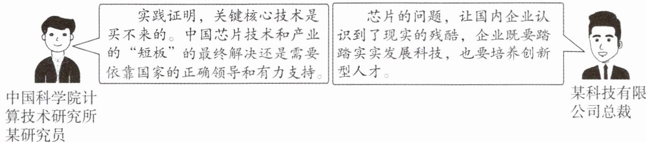 |中国科学院计算技术研究所某研究员|实践证明,关键核心技术是买不来的。中国芯片技术和产业的“短板”的最终解决还是需要依靠国家的正确领导和有力支持。|某科技有限公司总裁|芯片的问题,让国内企业认识到了现实的残酷,企业既要踏踏实实发展科技,也要培养创新型人才。|